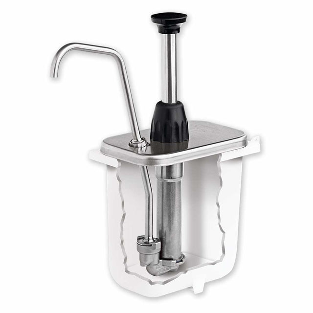 The CP-200, 2 oz stainless steel pump dispenses precise portions from your standard 2 quart (1.9 L) fountain jar. Each press or stroke serves 2 oz (60 mL) or can be reduced for 1 3/4, 1 1/2 or 1 1/4 oz (52, 45 or 37 mL) servings. Contents can be quickly identified by specifying a colored and engraved pump knob upon order, at no additional charge; black is standard.