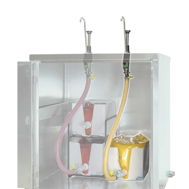The manually operated remote system simplifies high-volume dispensing; eliminates the hassles of a CO2 driven dispenser. The flush-mounted stainless steel pump taps into a large condiment or salad dressing pouch below the counter. New Quick Connect feature makes changeouts cleaner and adapts to both 16 mm fitment and 38 mm connector pouch styles.