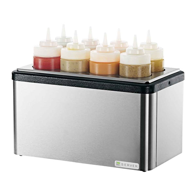 Keep (8) dressings and signature sauces cold and handy with a countertop Squeeze Bottle Station; a Mini Station Base and Squeeze Bottle Holder combination. Base is constructed of a stainless steel exterior, black plastic interior and insulation within. Brushed finish stainless steel reduces the visibility of fingerprints to help keep things looking neat and clean.