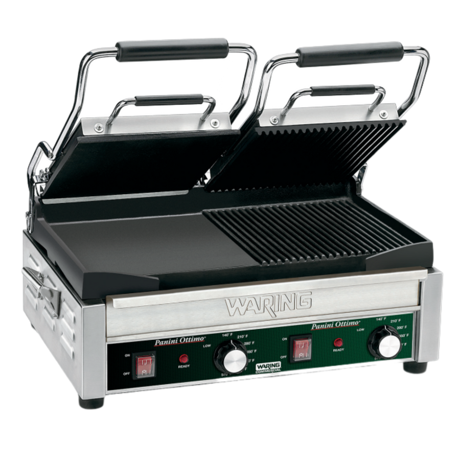 Make all your signature sandwiches and more with the WDG300 Double Italian-Style Panini/Flat Grill. Combination flat/ribbed cast-iron plates heat evenly and quickly cook sandwiches, burgers, chicken, and vegetables up to 3" thick. The brushed stainless steel body and removable drip tray are easy to clean. Includes adjustable thermostat to 570˚F, plus POWER and READY indicator lights and timer version available.