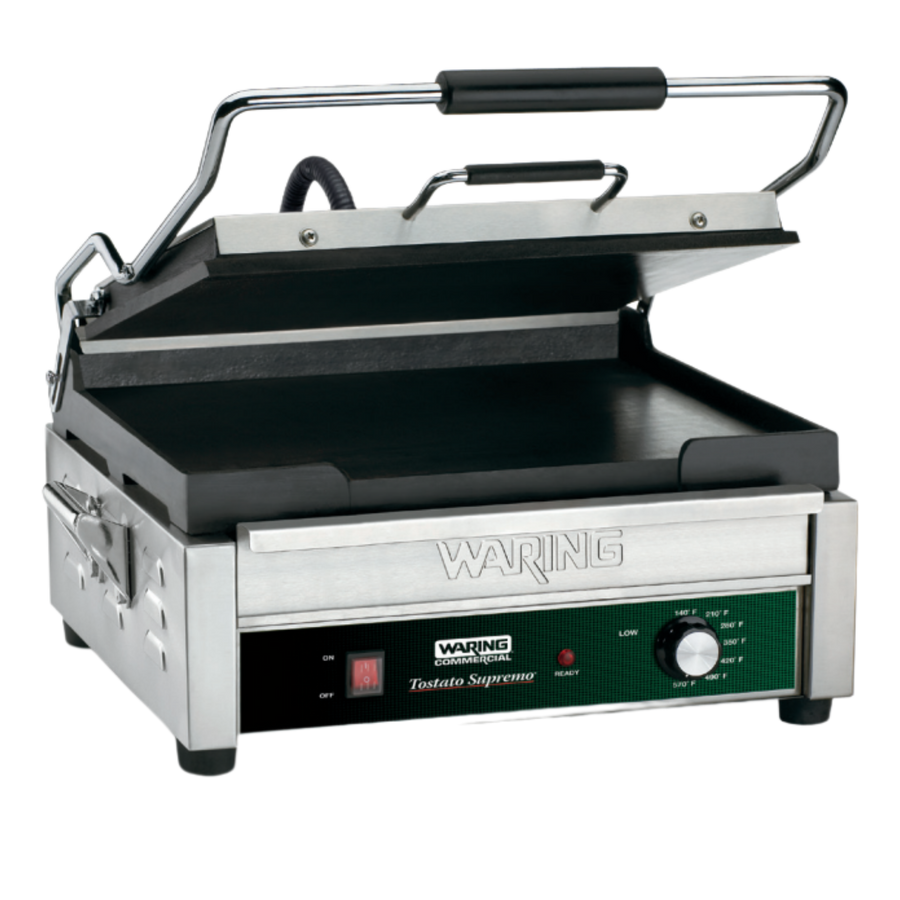 Make delicious quesadillas, tortillas, paninis and more with the WFG275 Full-Size 14" x 14" Flat Toasting Grill. Flat cast-iron plates heat evenly and quickly to cook sandwiches, burgers, chicken, and vegetables up to 3" thick. Its brushed stainless steel body and removable drip tray are easy to clean. Includes POWER and READY indicator lights and timer version available.
