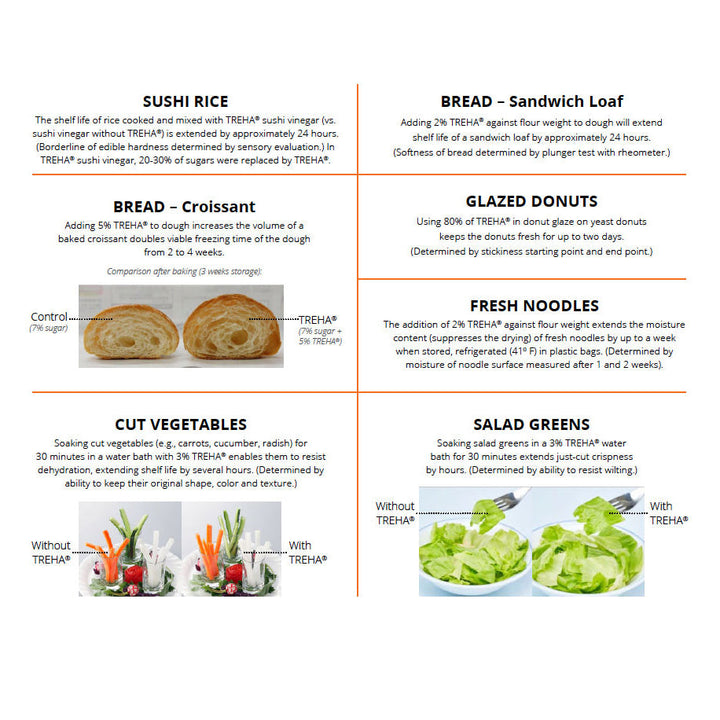 TREHA® Trehalose (Japanese: トレハロース; Chinese: 海藻糖) is a naturally occurring disaccharide found in foods like mushrooms and yeast. Only 38% as sweet as sucrose, it is a low-sweetness, plant-based sugar prized for its ability to extend freshness and improve food stability. Produced in Japan, TREHA® is GRAS-designated, Kosher, Halal-certified, and non-GMO.