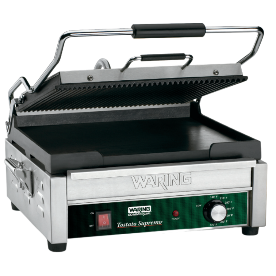 Préparez des sandwichs panini parfaitement grillés et bien plus encore avec le grand gril à panini de style italien WDG250. La plaque supérieure rainurée en fonte et la plaque plate en fonte sur la partie inférieure chauffent uniformément et rapidement pour cuire des sandwichs, des hamburgers, du poulet et des légumes jusqu'à 3" d'épaisseur. Son corps en acier inoxydable brossé et son bac d'égouttage amovible sont faciles à nettoyer. Comprend des voyants POWER et READY et une version minuterie disponible.